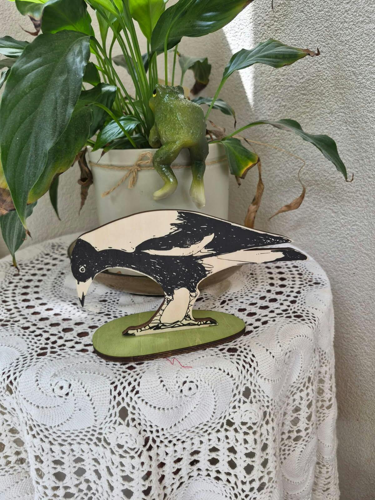 This is the much loved Australian Magpie. The two sides are different so you can choose whether you want to display a white backed magpie (found mainly along Southern and Eastern coast) or the black backed sub species (found throughout inland and northern Australia.)