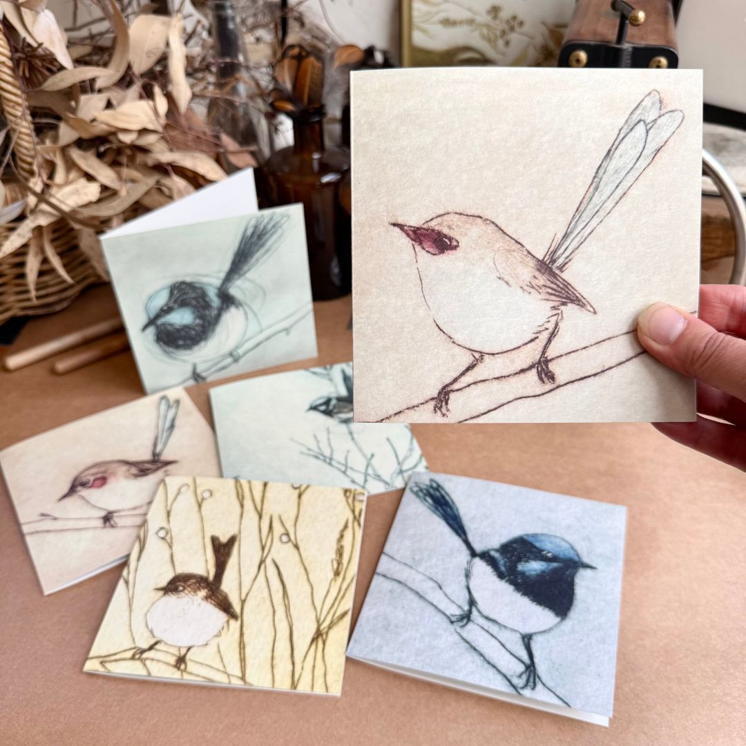 Bridget Farmer designs her range of bird themed products in her light filled central Victorian printmaking studio. She is visited by fairywrens, red-browed finches and the occasional nosey magpie. Her favourite bird (currently) is the brown thornbill who's sweet voice can be heard in the trees in her garden.