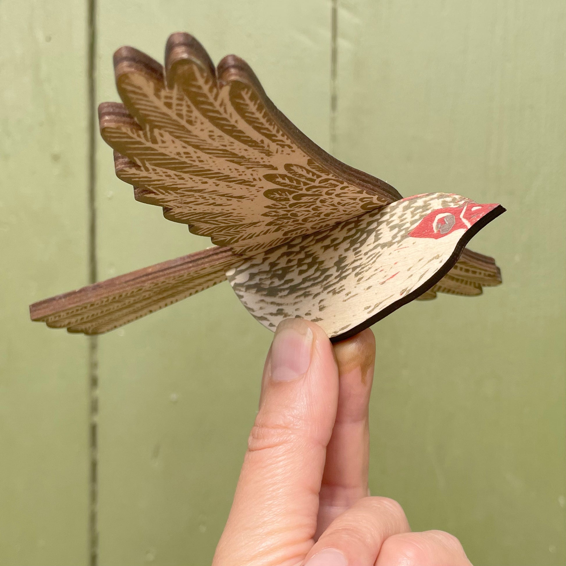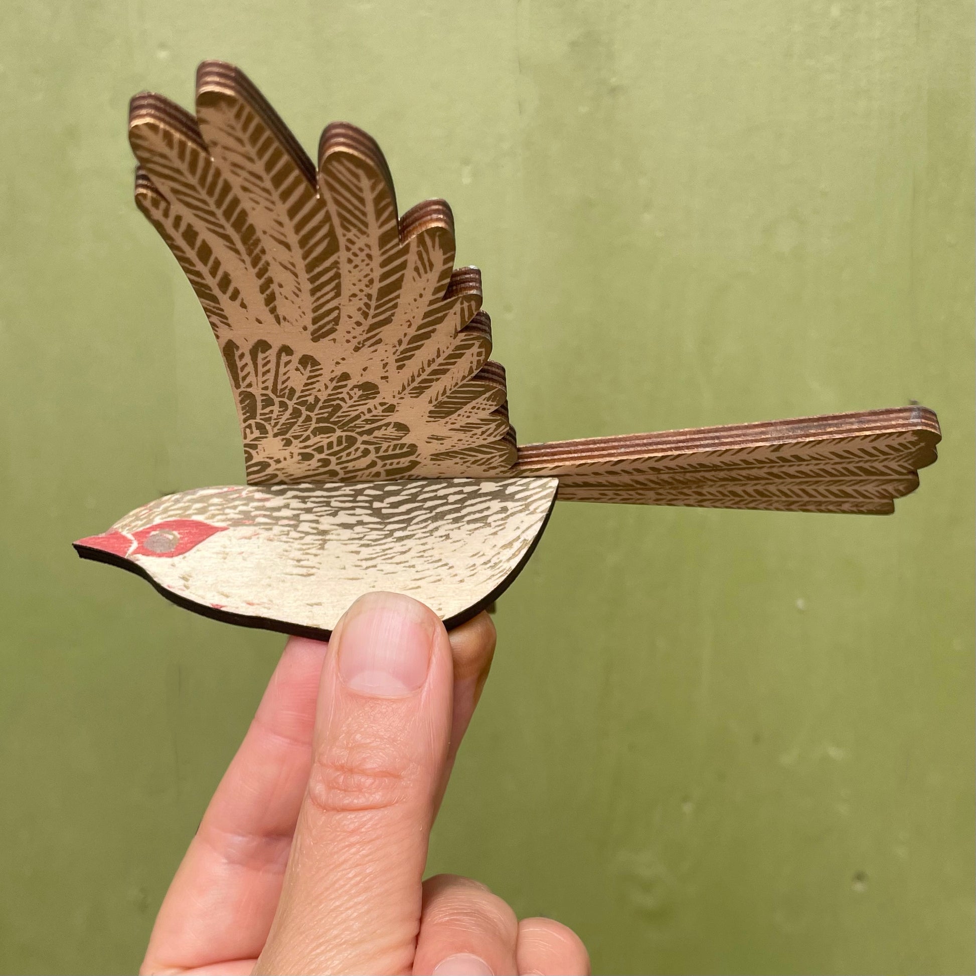 This is a mobile of a superb fairywren, or to be more precise a female superb fairywren. I feel the female fairywren is often outshined by her male counterpart so here is a little celebration of the girls in all their gorgeous glory! It is made of strong, laser cut, layered plywood and hand printed in multiple layers from hand cut lino plates.
