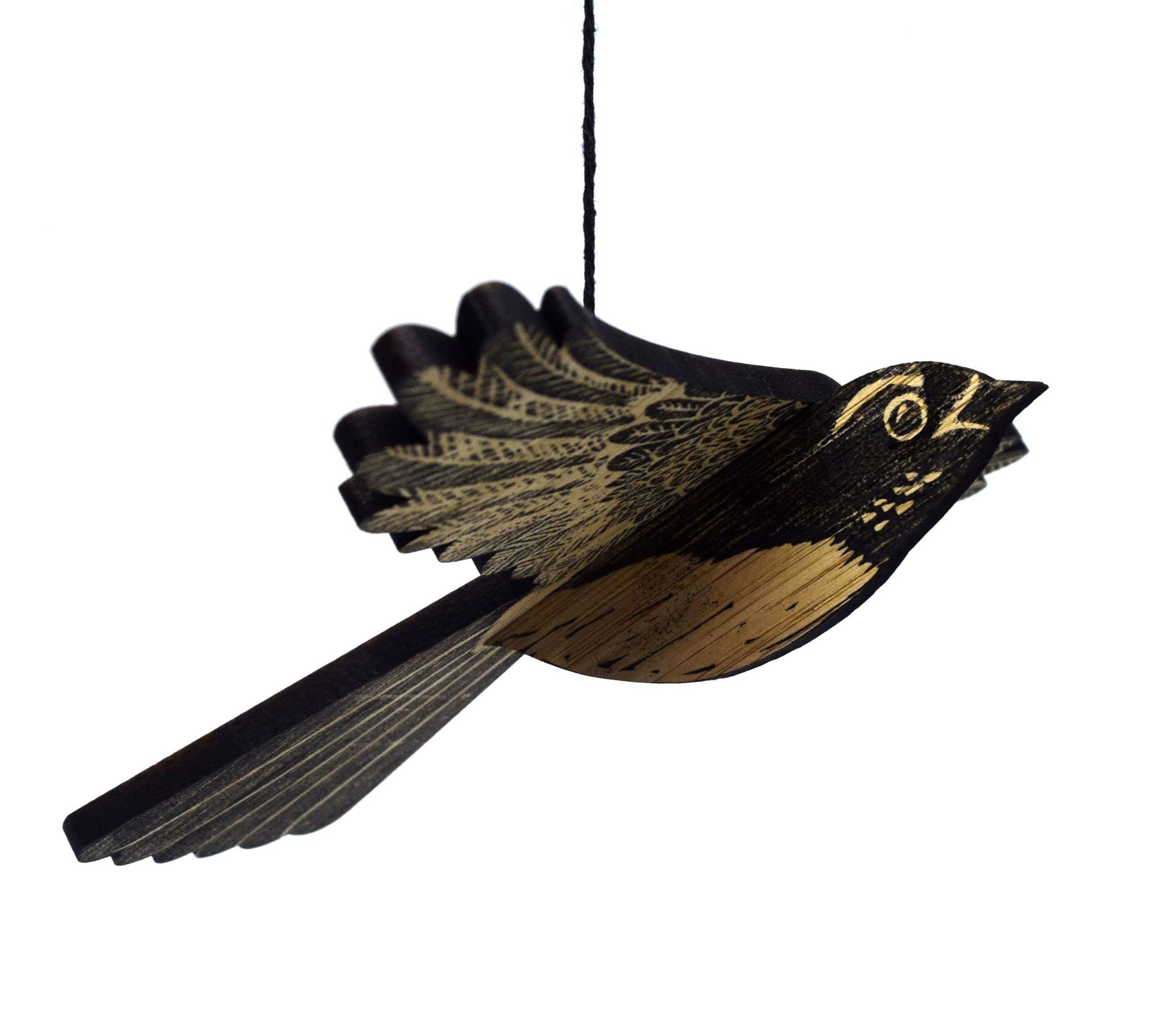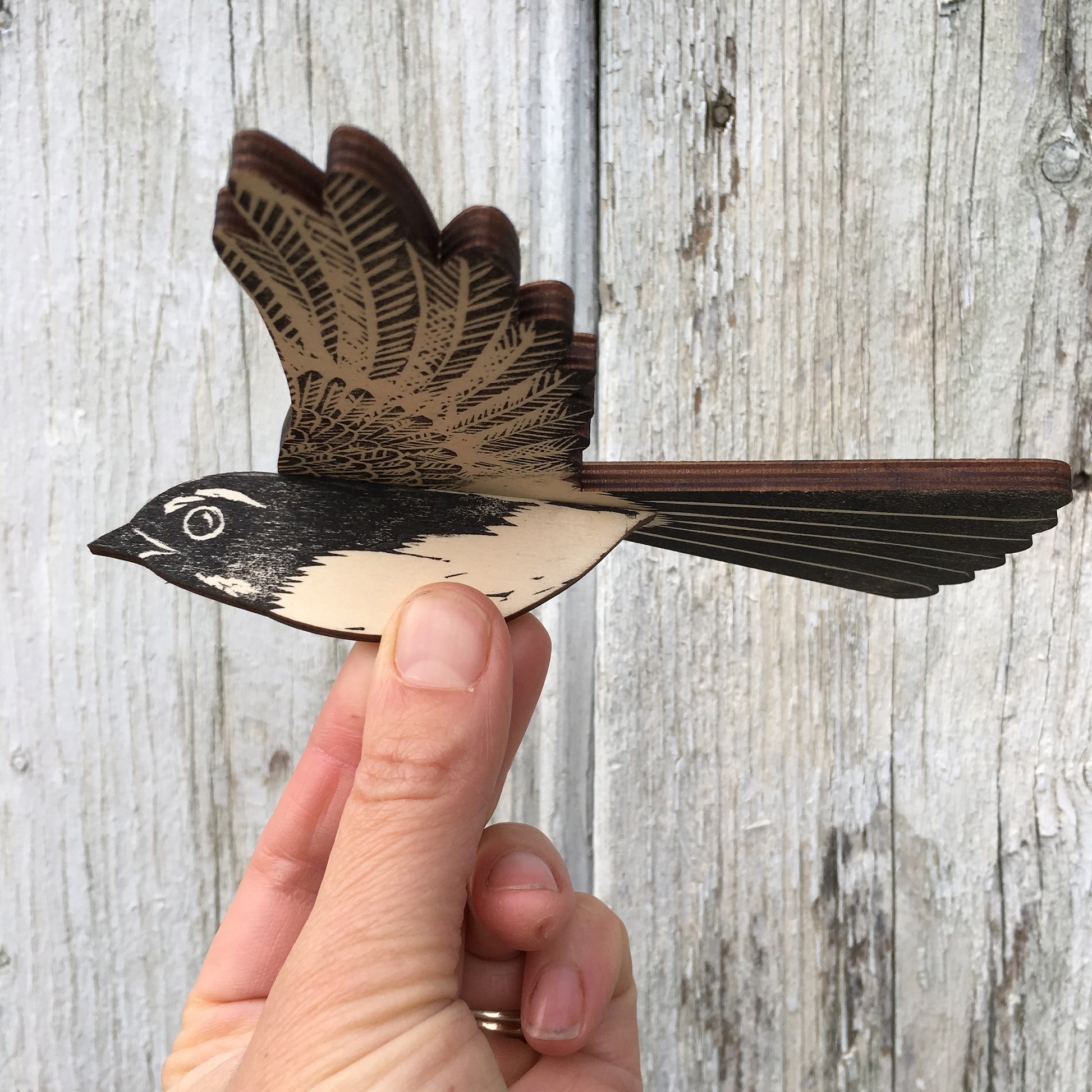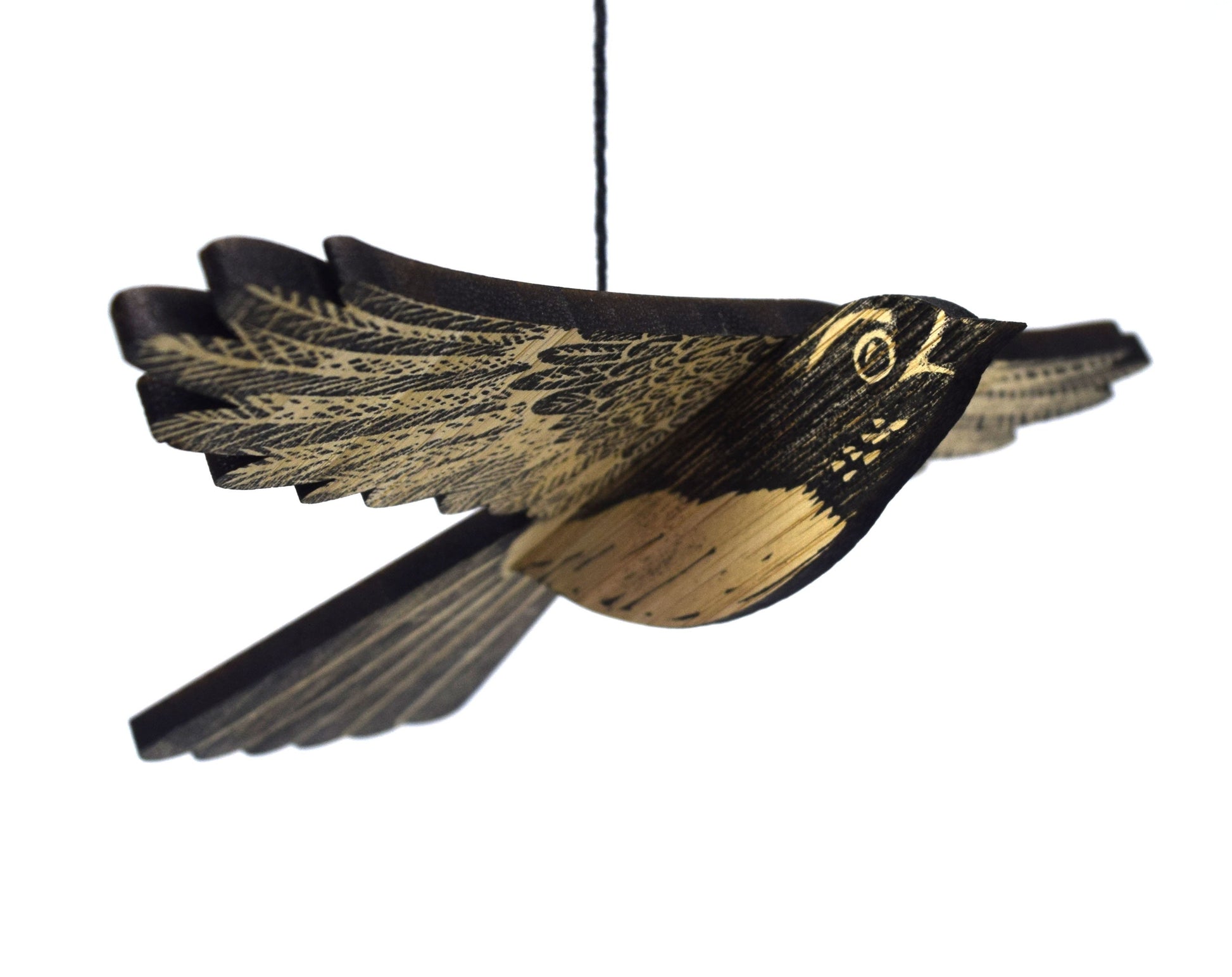 This is a mobile of a little willie wagtail. It is made from strong, laser cut, layered plywood and hand printed in multiple layers from hand cut lino plates.
