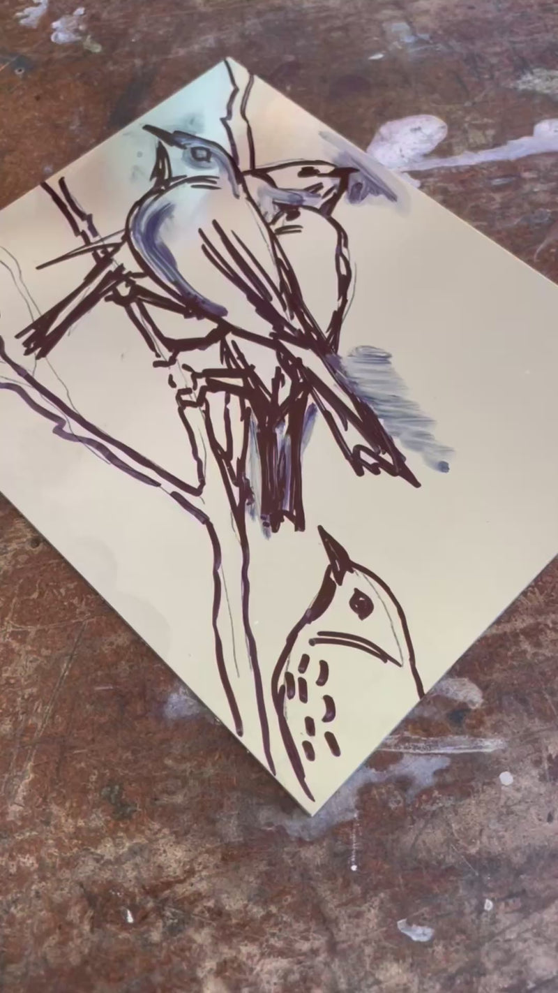 This is a drypoint etching of a flitting flock of yellow-plumed honeyeaters. I met these birds while sitting quietly in the middle of the Mallee bush while on a camping/ birding/ art trip to Hattah Kulkyne National Park in August 2025.
