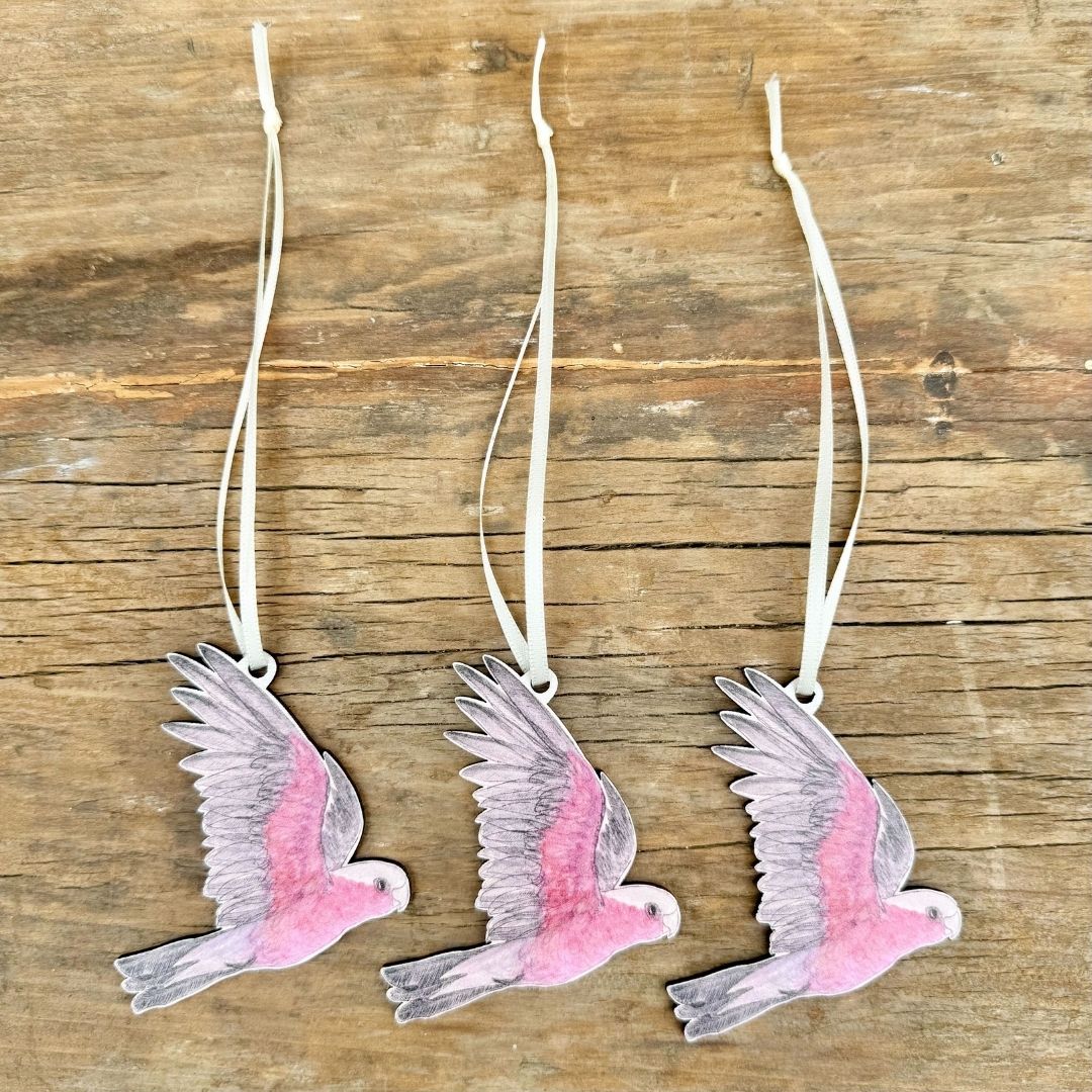 A small flock of cheeky galahs for your Christmas tree! This set includes three beautifully detailed Galah ornaments, each made from sustainably sourced wood and inspired by Bridget’s original etchings.